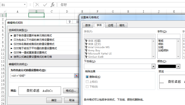 2,在条件格式里面新建规则”=A1="你好"“,并在格式设置中将字体颜色设置为黑色,如图: