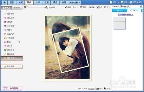 还有一个最后的也是最关键的一步啦,就是还有个小夹子,就好像是把照片夹起来一般,起到了很好的修饰效果,这个素材已经跟画中画电脑拼图软件打包在一起了,下载解压里面就有了。点击饰品选项,点击导入饰品,,将小夹子素材添加进来,再点击用户自定义,右边就会出现了刚才添加进来的小夹子素材了。点击一下即可应用到图片上了,再将大小和位置调整好就可以啦。