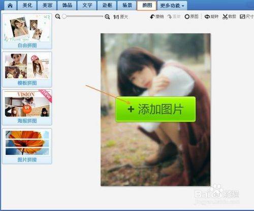 那么现在就来进行拼图吧,点击上面的主菜单栏上面的拼图选项,就会在中间有一个绿色的“添加一张图片”的按钮,那么不用犹豫的点击它,将刚才裁剪时候保存出来的图片添加进来吧。