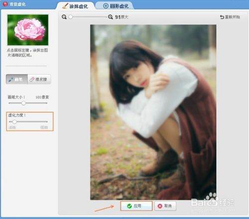 然后再回到刚才的界面,先将这张作为背景的图片虚化一下,点击左边的背景虚化,并在左边调节虚化力度的参数,调整到合适的虚化效果就可以啦。点击应用按钮即可应用并回到刚才的界面。