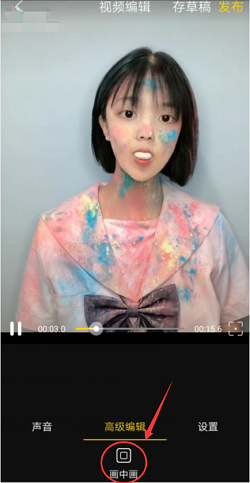 视频编辑页面中,有声音、高级设置、设置三种操作,制作画中画需要点击高级编辑中的“画中画”功能。