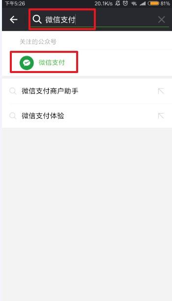 2、在该页面中点击打开公众号中的搜索框,搜索“微信支付”。