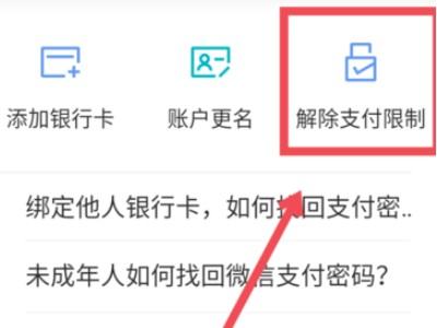您好,微信支付被限制解除方法,以华为p20手机为例: 1、打开手机中的微信,点击打开微信中的“支付”。 2、在弹出来的窗口中点击打开钱包中最下方的“帮助中心”。 3、在弹出来的窗口中点击打开“解除支付限制”即可。 扩展资料 微信支付安全保障有以下: 1、技术保障:微信支付后台有腾讯的大数据支撑,海量的数据和云计算能够及时判定用户的支付行为是否存在的风险。基于大数据和云计算的全方位的身份保护,最大限度保证用户交易的安全性。同时微信安全支付认证和提醒,从技术上保障交易的每个环节的安全。 2、客户服务:7*24小时客户服务,加上微信客服,及时为用户排忧解难。同时为微信支付开辟的专属客服通道,以最快的相关文章