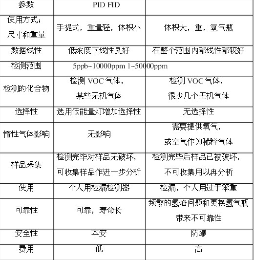 PID往往比FID 体积小,重量轻,结构简单。PID只有6盎司,而FID将有几磅,FID还要求配备氢气瓶,在运输和使用过程中带来了一定的安全隐患。而PID在重污染区域内使用需要我们对灯和传感器进行清洁。PID和FID性能对照表