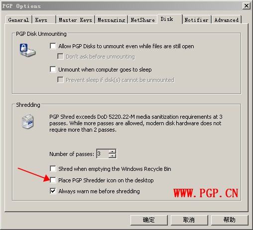 打开PGP软件,在Tools菜单里进入options,在 Disk 项里,将红色箭头的选项去掉即可。