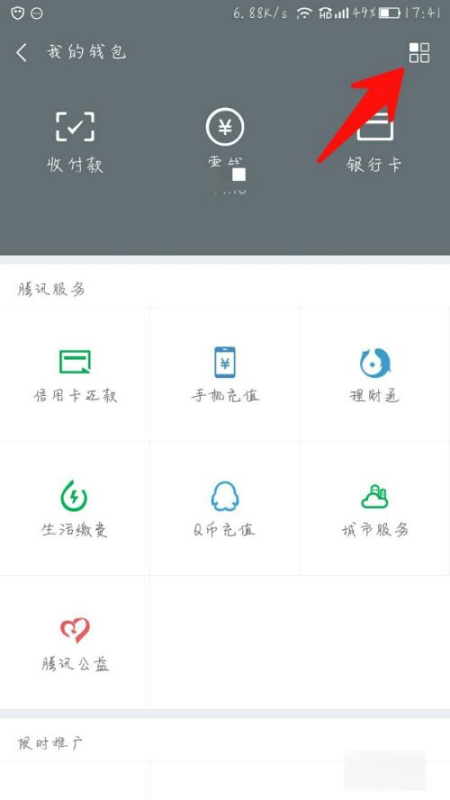 打开微信,点击右下角的我,进入到个人信息界面,再点击钱包。进入我的钱包界面后,点击右上角的四个小方块按钮。