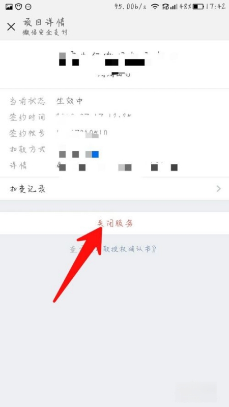 8、在里面可以看到你签约的自动扣费服务,现在选择你想解除的服务点击它进入服务详情里面然后选择关闭服务。