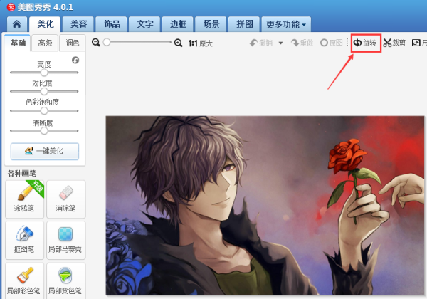 1、使用美图秀秀打开图片,点击右上角的【旋转】。