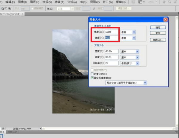 4、在出现的“图像大小”窗口界面中宽度和高度的数值互换,便可得到横着的图片。宽度和高度内的数值可根据个人的需求填写。