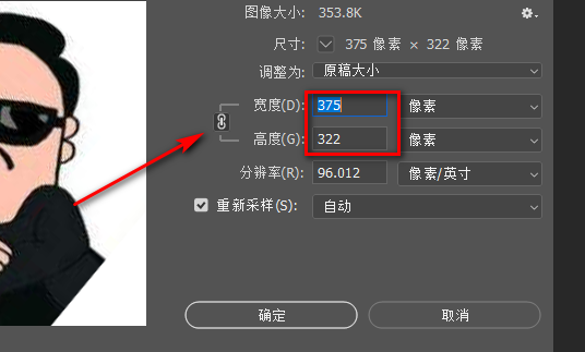 3、进入图像大小页面,把宽度和高度之间的约束比例勾选上,然后调整宽度,高度就会自动更改。