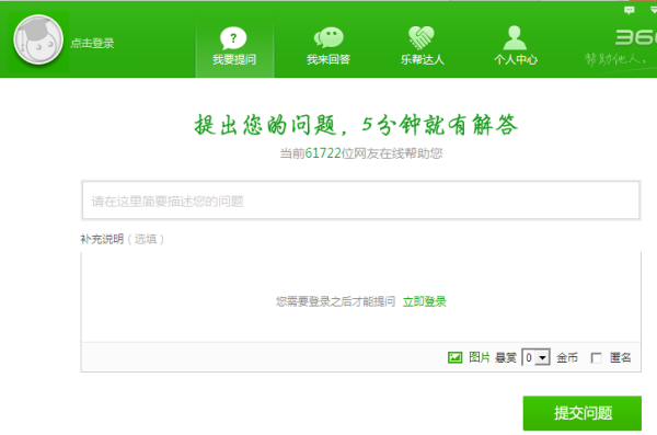4、点【我的提问】选项卡,点【立即登录】,登录360帐号,然后输入提问标题和提问内容,输入完毕后点【提交问题】。