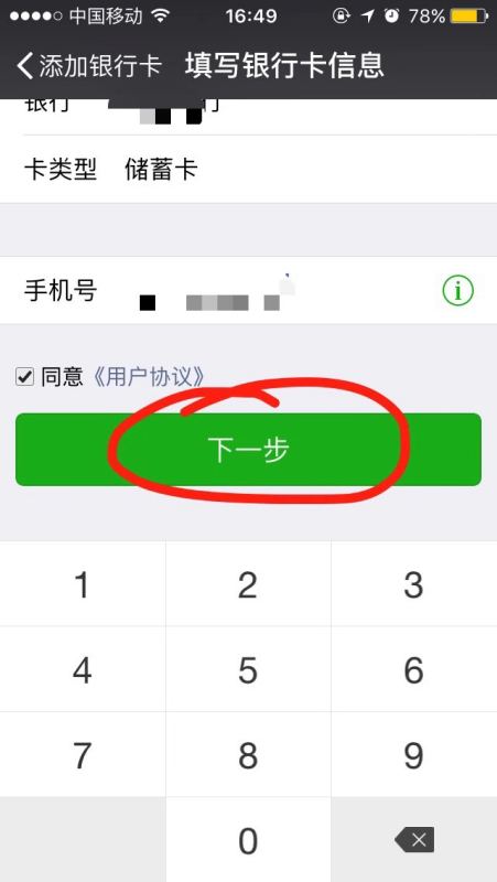 5、填写银行卡信息时,核对发卡银行是否一致,然后输入自己的手机号,点击“下一步”;