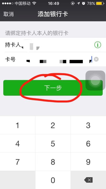 4、在添加银行卡时,界面上会显示自己的姓名,输入自己的银行卡卡号后,点击“下一步”;