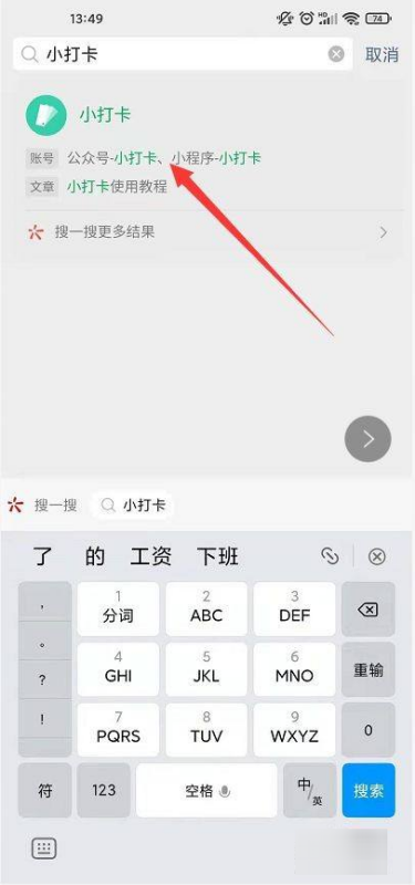打开微信主要,输入【小打卡】搜索,点击【小打卡】,点击【小打卡】小程序进入。