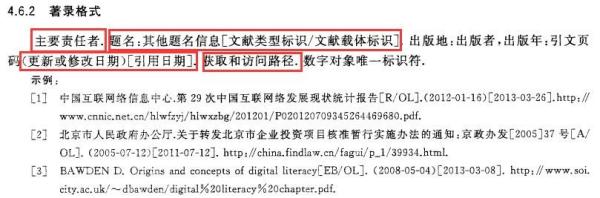 中华人民共和国国家标准GB/T 7714-2015《文献与信息 参考文献著录规则》第4.6条给出了电子资源参考文献的著录格式,见下图。