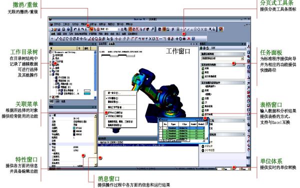 NFX是唯一一款中文的有限元分析软件,具有良好的操作界面,亲切、清晰、易于使用且方便记忆,其操作界面如图1.1.1所示。NFX操作界面窗口包括主菜单、工具栏、工作目录树、关联菜单、特性窗口、信息窗口、任务流程面板、表格窗口和单位体系等。与市面其他有限元软件相比,NFX软件的另外一个鲜明特点是全中文的帮助文档及技术资料。