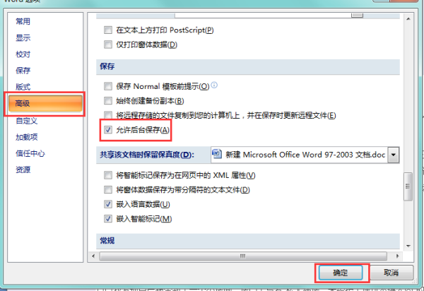五、选择“高级”,最后取消勾选“允许后台保存”点击“确定”即可解决。