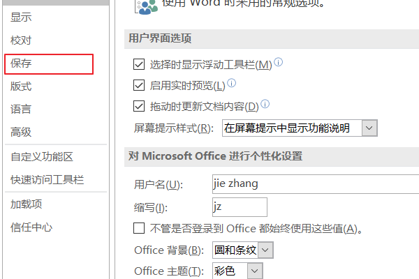 点击”文件“→”选项“,在出现的对话框中,选择”保存“。按照下图标注设置即可示:
