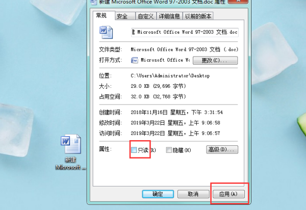 二、取消勾选“只读”,点击“应用”。