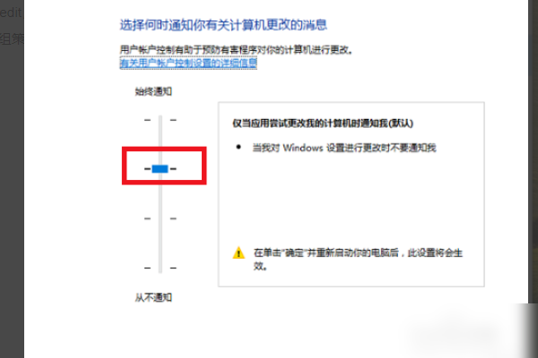 8、进入用户账户控制设置界面,如下图所示,我们将通知的滑动条滑到从上至下数第二个位置。然后点击【确定】按钮。再次重启电脑就可以正常使用Edge浏览器了。