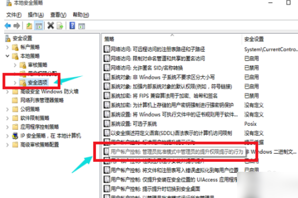 4、此时,我们找到[安全选项]并单击以在下面的红色框中找到[用户帐户控制:管理员批准模式下管理员的提升权限行为],然后单击打开。