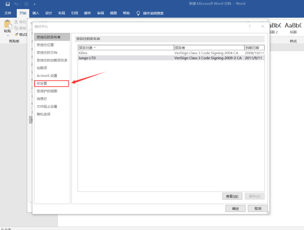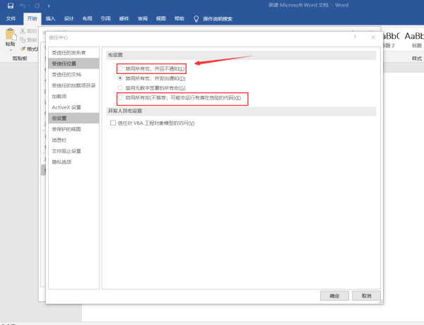 4.弹出对话框,设置“启用所有宏”。设置好了以后,就不会有禁止宏的提示出现了。这样就解决了WORD中的宏被禁止的问题了。