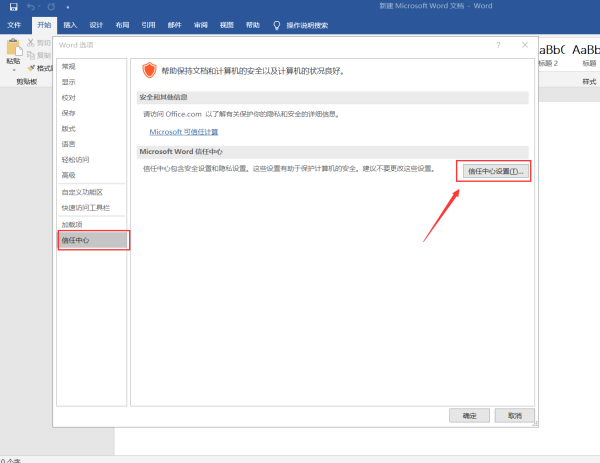 2、在【Word选项】对话框中,点击侧边栏的【信任中心】,然后再选择里面的【信任中心设置】;