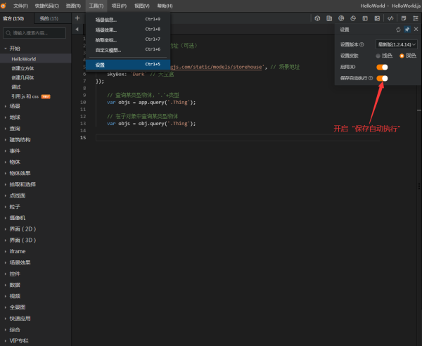 选择菜单区域的“工具 - 设置”选型,出现的设置面板,点击开启“自动保存执行”