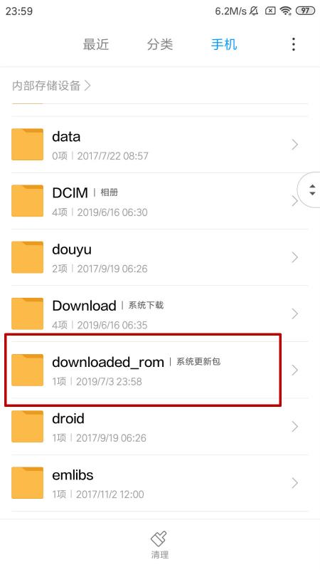 小米手机系统更新包在手机内置存储的downloaded_rom文件夹。你可以打开手机文件管理APP找到该文件夹进行查看。具体操作步骤如下: