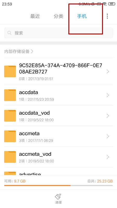 3、在文件管理界面,选择【手机】选项,点击打开。