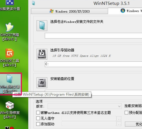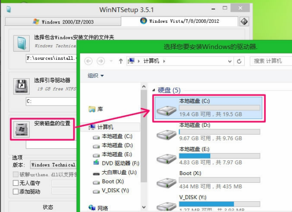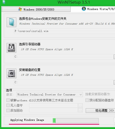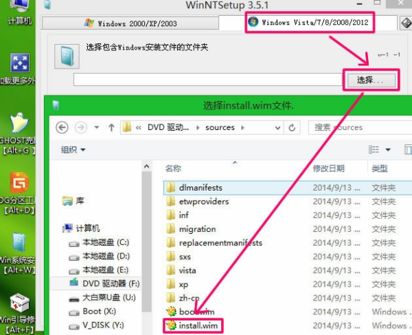 然后点击第一项的选择,选择安装源.在虚拟光驱的sources目录下找到install.wim,点击打开,完成第一步.
