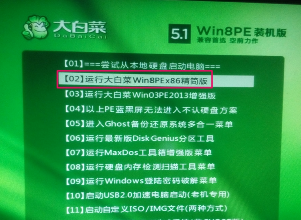 2、我的是大白菜PE,选择第二项,进入WIN8版的PE