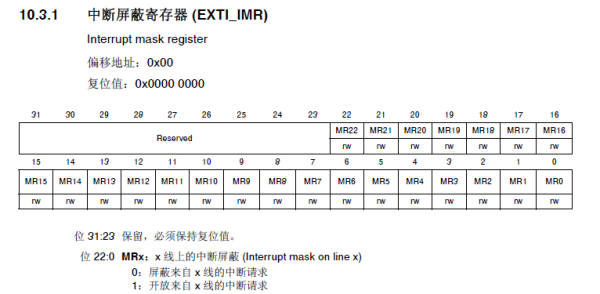 由于我们操作的中断线是EXTI3,而IMR寄存器各位解释如下: