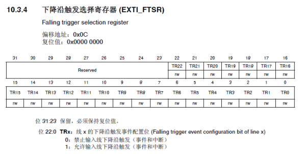 与此同时,查看EXTI_FTSR寄存器,可以看到: