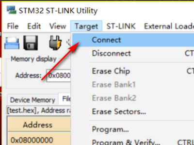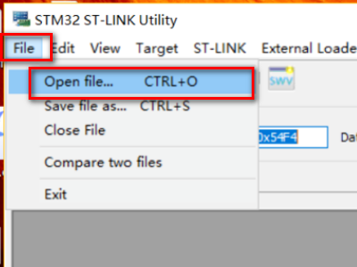 1、首先打开STM32 ST-LINK Utility,依次选择“File ->Open File...”或者按快捷键“CTRL + O”准备打开一个烧录文件。