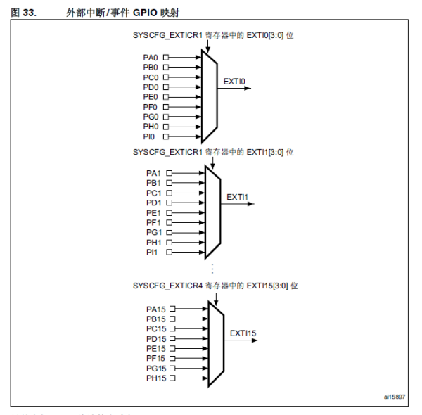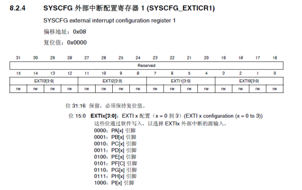 由于PE3对应的中断线为EXTI3,所以,我们我们这里仅需配置EXTI3,而EXTI3是在SYSCFG_EXTICR1中的;