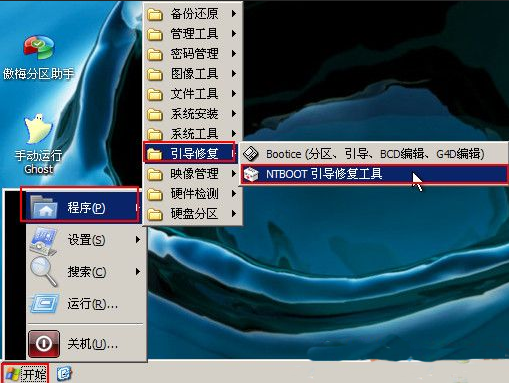 2、进入pe系统后,依次打开“开始菜单-程序-引导修复-NTBOOT引导修复工具”,如下图所示: