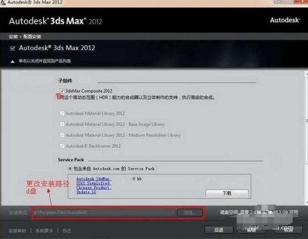3dsmax2012 32/64位中文版默认的安装路径是在c盘里,根据自己需要更改所安装盘。还有一个就是补丁 ,点击下载补丁就可以。