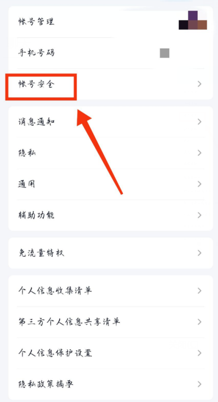 4.点击"手机号码"下面的"账号安全"。
