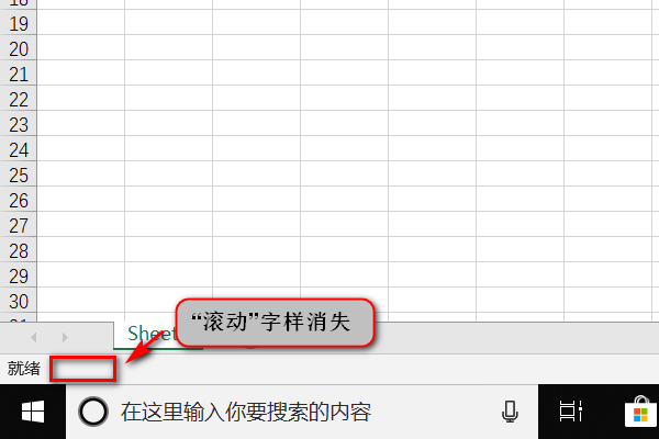 3、可以看到,状态栏的”滚动“状态已经不见了,这是因为”ScrollLock“键取消了锁定。这时,再按“上、下、左、右”的控制键时,将可以正常的跳到下一个单元格,而不是整个表格移动。
