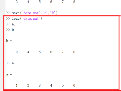 4、如果我们想保存多个变量到mat文件中,可以通过save('data.mat','a','b')的方式,data.mat是生成的mat文件名,a和b是存入的变量。