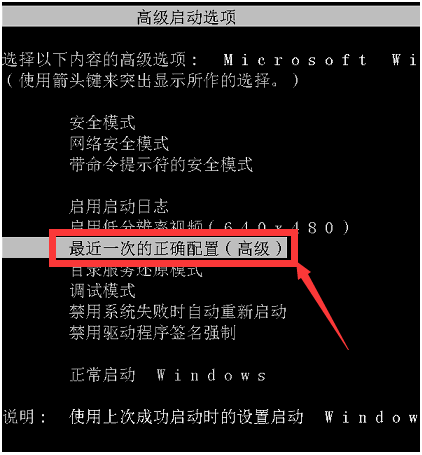 (1)重新启动电脑,当出现可用的作系统列表时,按F8键进入Windows的高级选项菜单,选择“最后一次正确配置”,敲击回车键,进入系统。