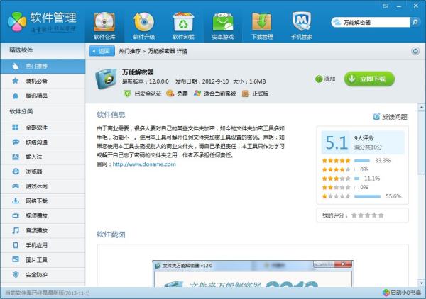 3,然后打开电脑管家——软件管理——软件仓库——右上角搜索【万能解密器】,尝试破解您软件密码。