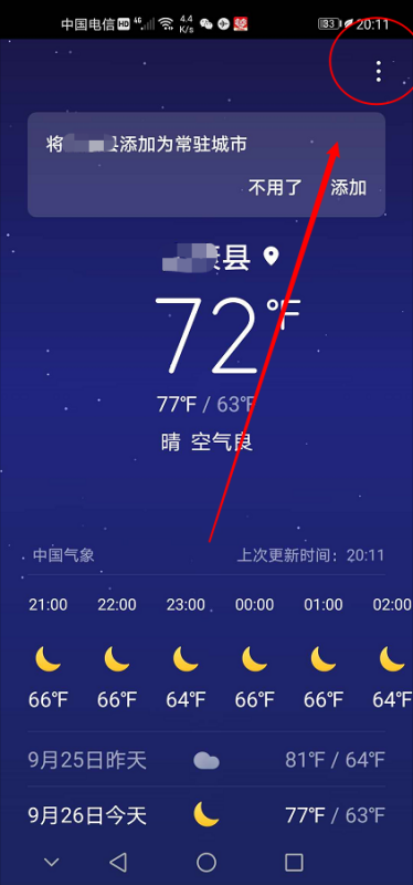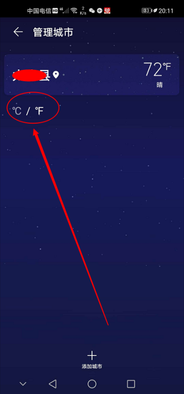 3、选择城市管理一栏,进入后,点击°F/°C图标进行切换即可。
