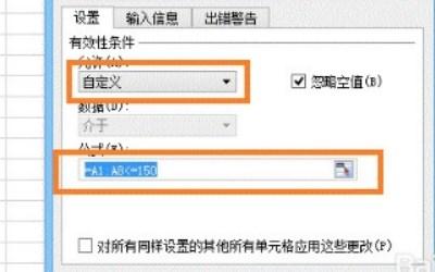 第三步:有效性里选择允许“自定义”,在公式那里输入范围:=A1:A8<=150即可。