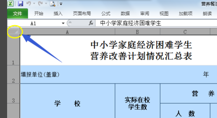 2.第2步:重点步骤一,鼠标左键单击图中所示位置(数字1的上方),单击后能够选中全部的单元格。