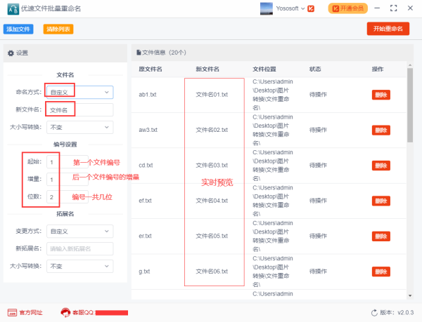 步骤2,随后在软件左边进行设置,命名方式选择“自定义”方式;然后在下一栏输入新的文件名;最后在下面进行编号(排序)设置,起始是第一个排序编号,增量是后一个编号增量的量,位数设置排序编号一共几位数(不够的话用0凑)。右边可以随时预览到新文件的名称。
