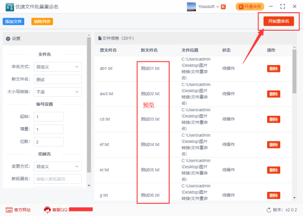 步骤3,这时候我们可以在右边预览到新文件的名称,如何符合自己的预期,就可以点击“批量重命名”按钮,启动批量处理了。