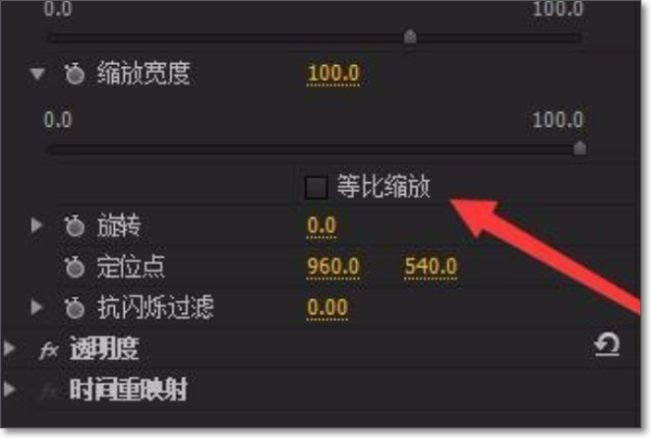 5、去掉-等比缩放-前面的勾选,就可以不等比进行视频缩放,