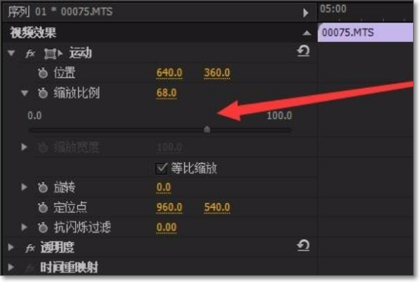 4、点击打开这个倒三角,打开比例控制条,调节即可改变视频大小,